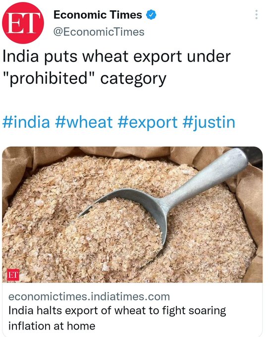 1 day agoNew Delhi had previously claimed it could feed the world in the wake of the conflict in Ukraine. India prohibited wheat exports that the world was counting on to alleviate supply constraints sparked by the war in Ukraine. 6 hours agoNEW DELHIIndia said it would ban wheat exports in a move that will add to global inflationary pressure and further strain global food supplies.